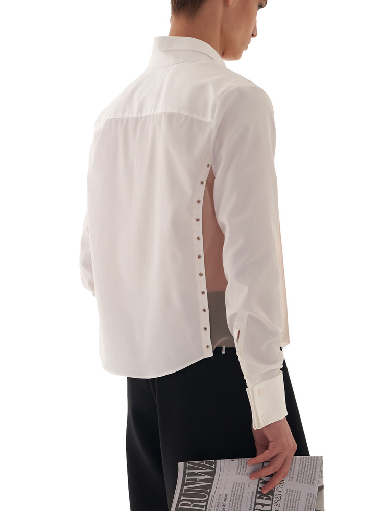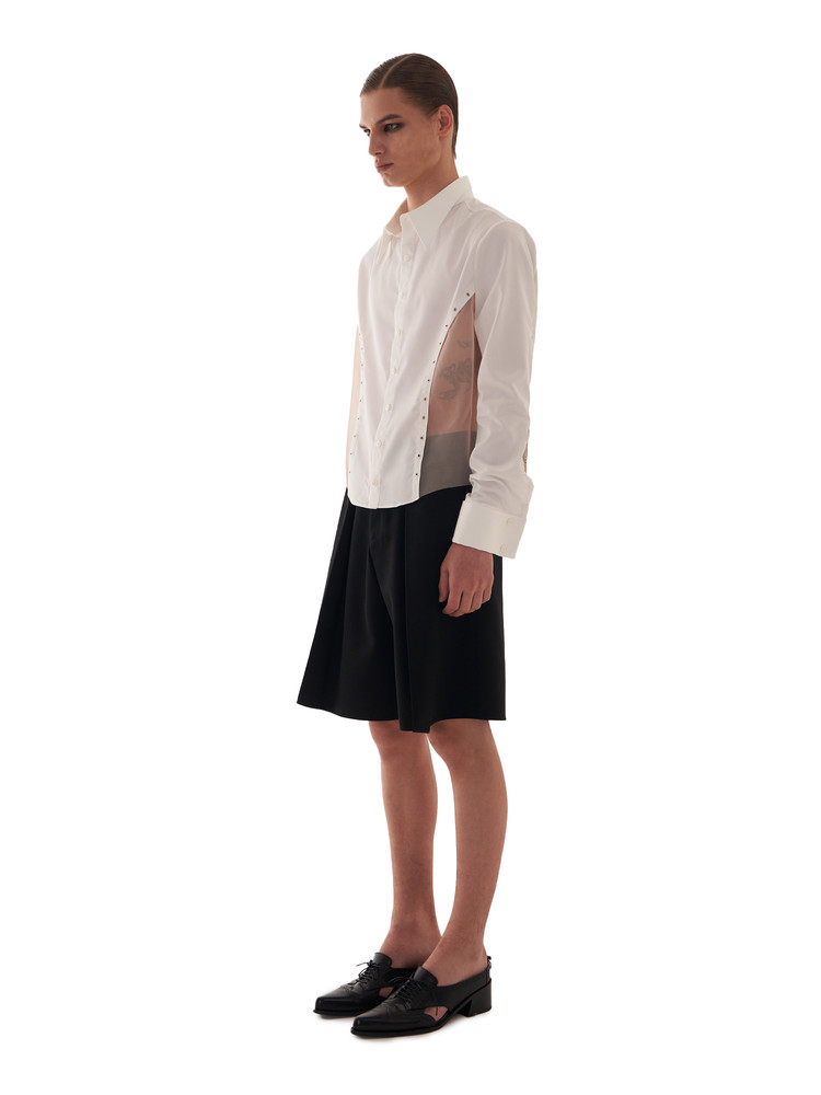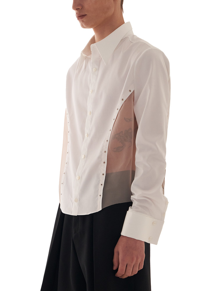 This dress shirt juxtaposes a formal classic design with side tulle panels, while a series of eyelets adds a provocative, fetish-inspired touch. Finished with French cuffs, it combines refined elegance with a sensual edge.