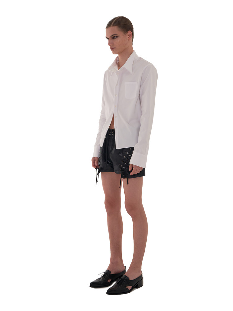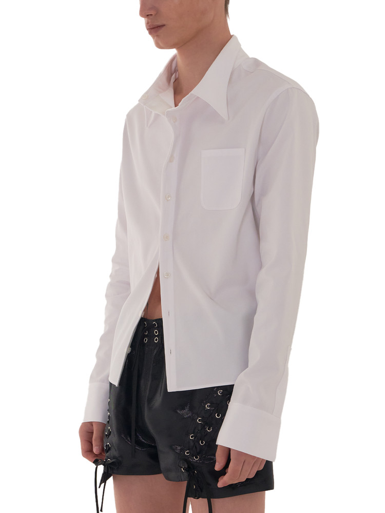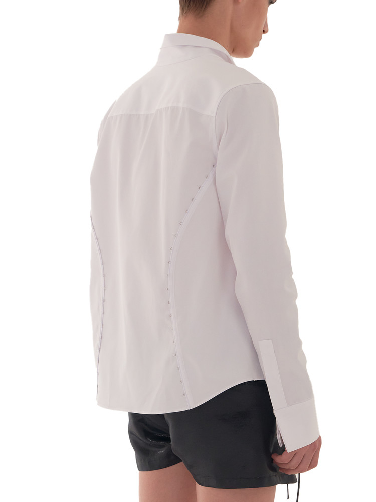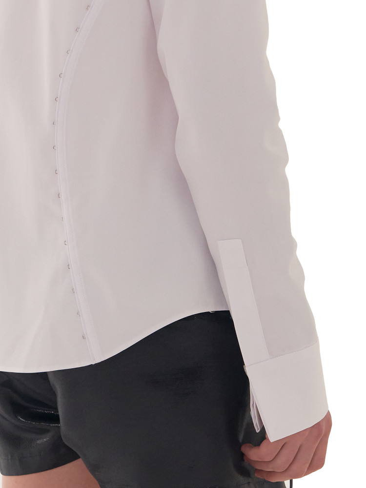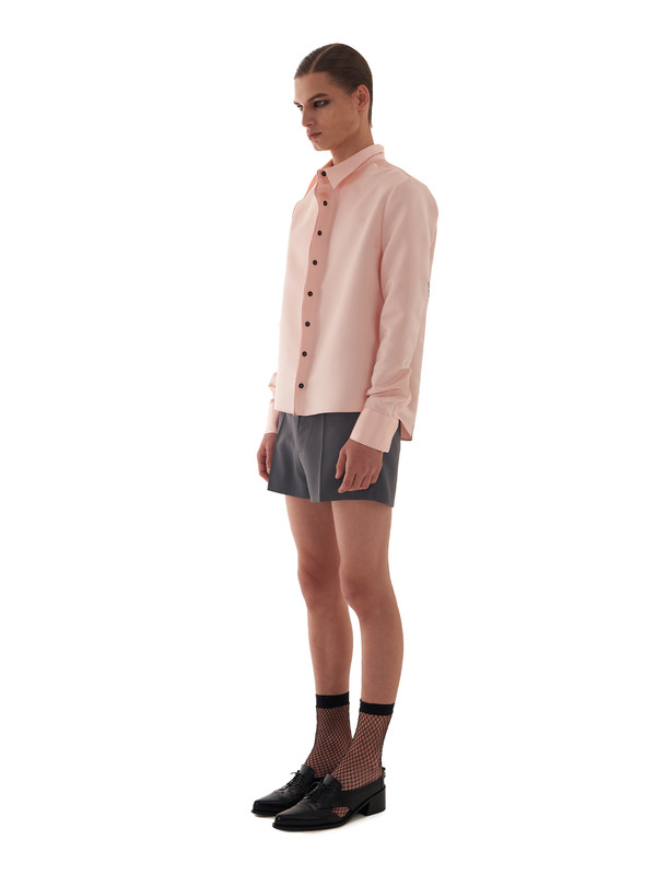 This cotton shirt introduces a fresh silhouette with its distinctive gathered collar. The hidden cuffs and elevated collar stand further enhance the formal mood, creating an elegant and unique style statement.