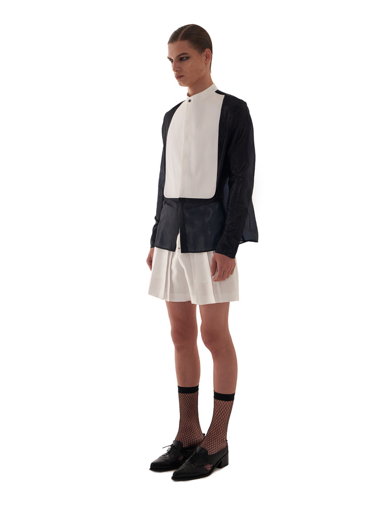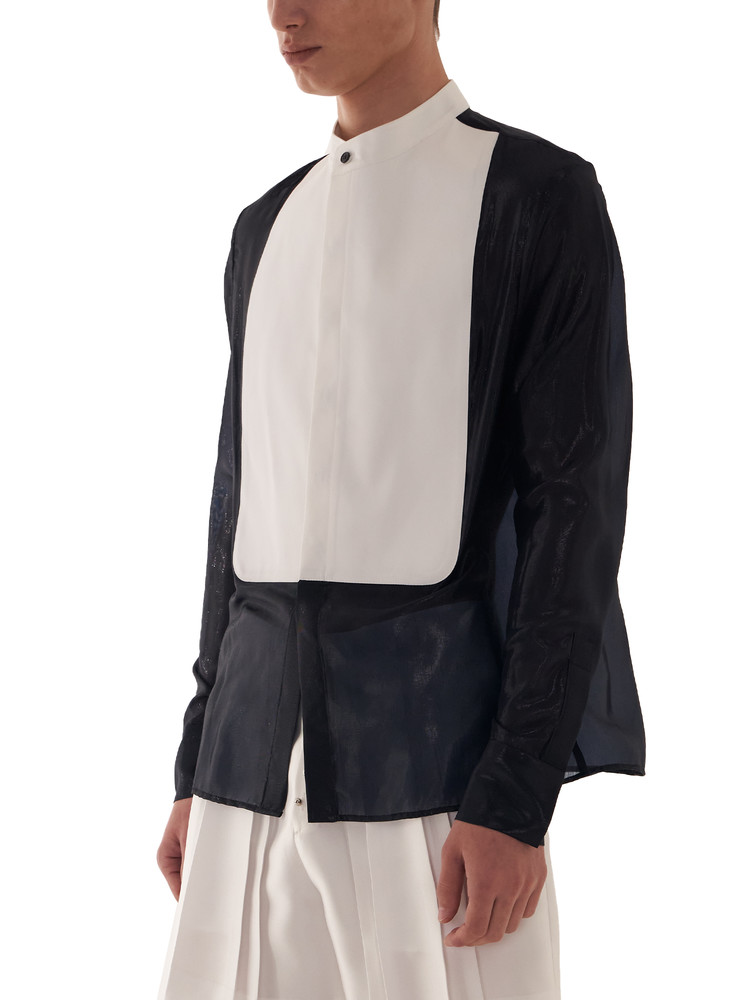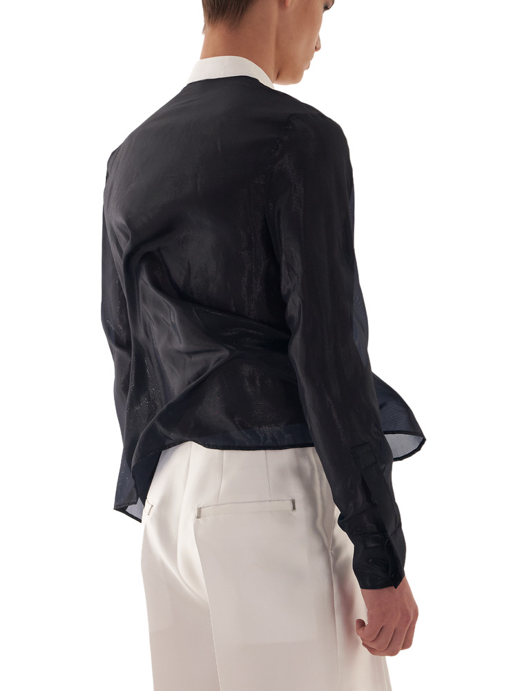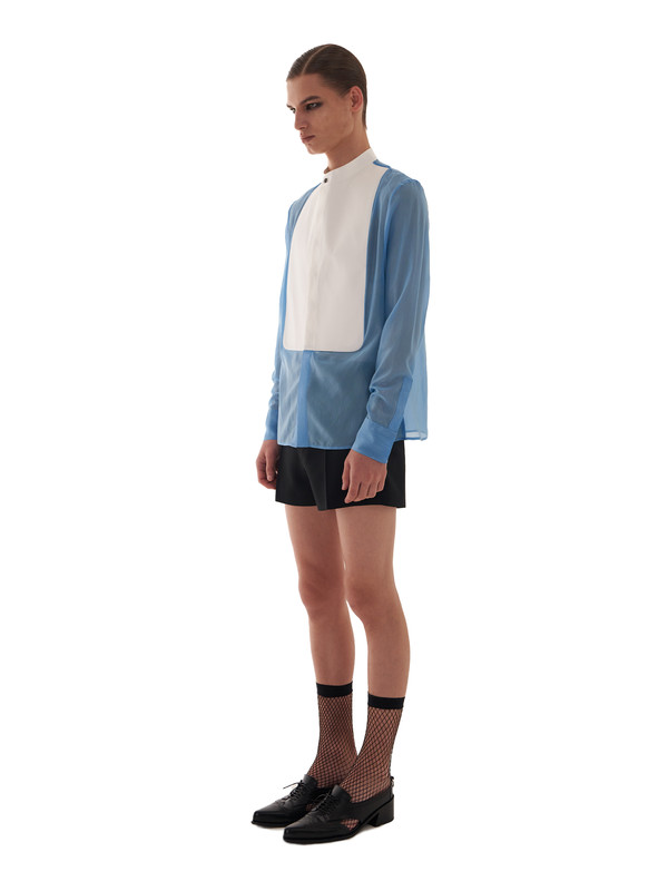 ― Silk shirt emphasizing the contrast between sheer fabric and plastron
