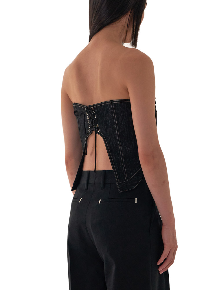 Featuring a bare back design and vertical texture denim fabric, this tube top combines intricate Japanese floral lace with the boldness of a trucker jacket. It showcases the modern beauty of 2728® with its unique and sophisticated style.