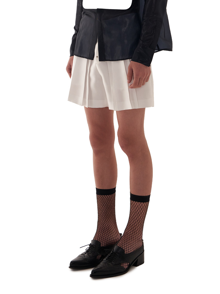 These shorts highlight the historical Watteau pleat detail on a minimalist surface. Adorned with a subtly lustrous fabric and premium metal hardware, they offer a sophisticated and classic charm.
