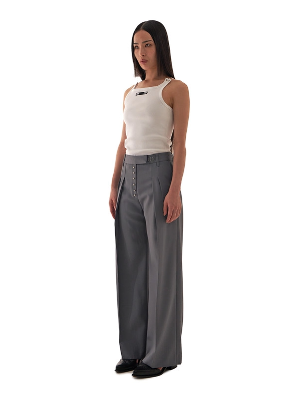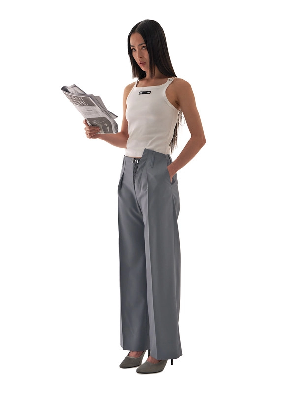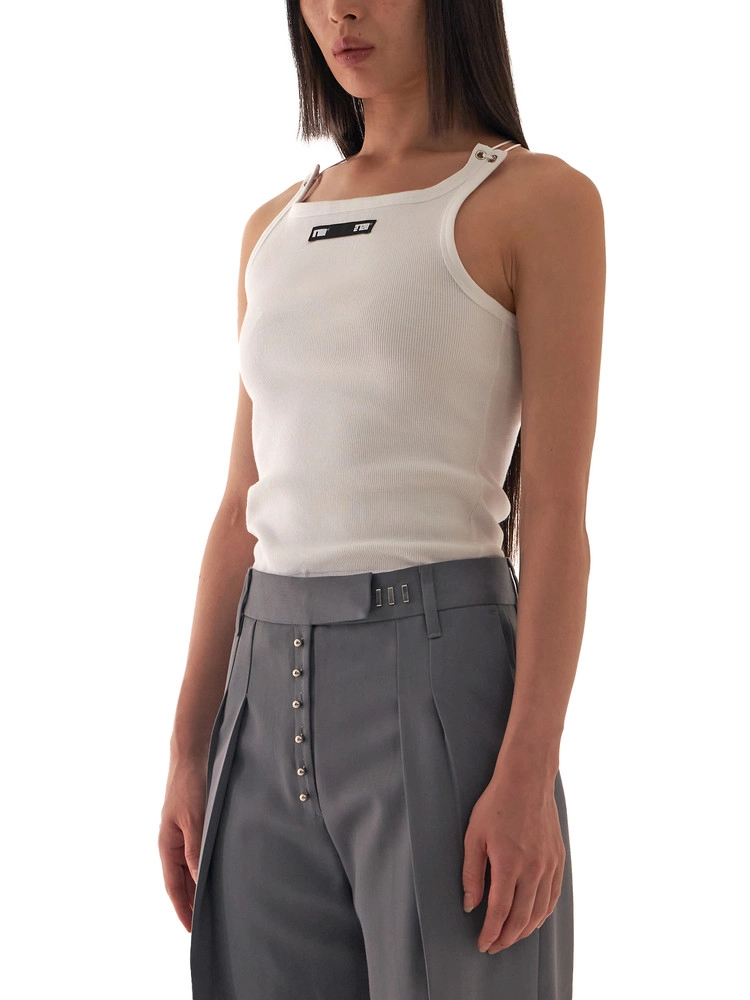 This tank top features a striking contrast between its rugged appeal and delicate shoulder straps. The blend of bold and subtle elements creates a distinctive and unique style.